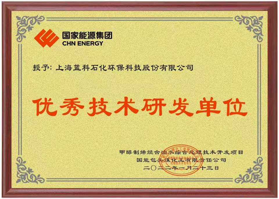 近日,上海蓝科石化环保科技股份有限公司荣获国能包头煤化工有限责任公司“优秀技术研发单位”称号,并收到来自国能包头煤化工有限责任公司甲醇制烯烃含油水综合处理技术开发项目的表扬信。
